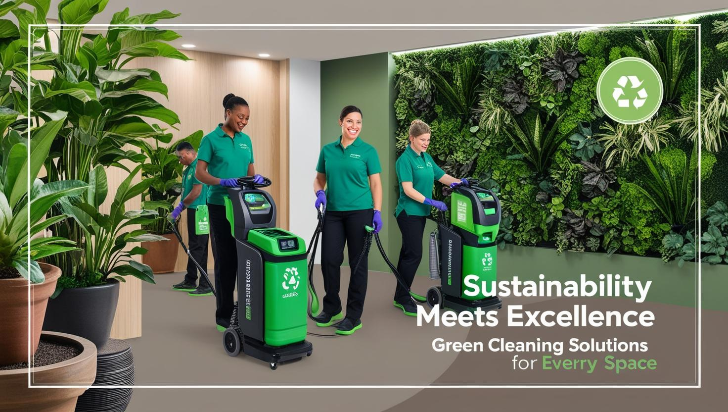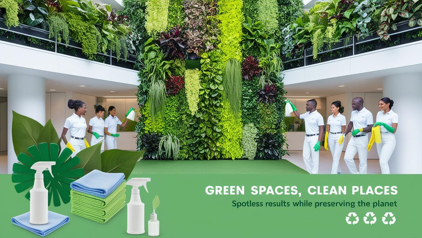 A team of professionals uses innovative, eco-friendly cleaning equipment surrounded by lush greenery. Their green uniforms and recycling-themed tools symbolize a commitment to sustainability and excellence The vertical garden and modern space reflect a harmonious blend of nature and technology. Together, they inspire a cleaner, greener future for every environment.
